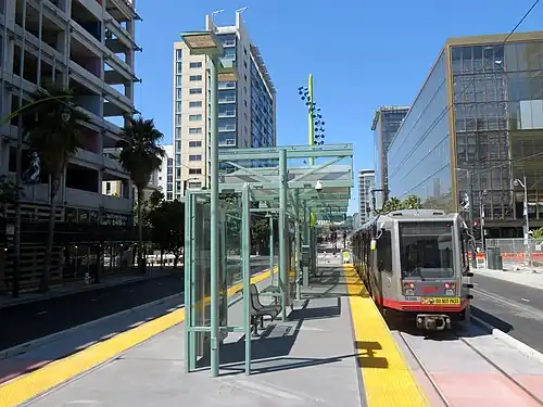 The station serves the adjacent Chase Center arena, which opened on September 6, 2019. It was expanded to accommodate high ridership and increased service on game days. Initial plans in mid-2015 called for the northbound platform to be doubled in length to 320 feet (98 m).[8] Later that year, a variant design with a 320-foot (98 m)-long island platform south of South Street was proposed, which would allow two two-car trains in each direction to simultaneously serve the station. Construction of either design was expected to take 14 months and included the installation of a crossover to allow trains to reverse direction at the station.[9] In October 2015, the team, city, and UCSF reached a preliminary agreement under which the city and UCSF supported the construction of the arena, in exchange for a package of transportation improvements which include the expanded station and the purchase of four additional light rail vehicles.[10]
