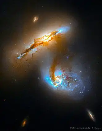 A tenuous bridge of gas, dust and stars can be seen connecting the two galaxies, created when they pulled material out into space across the diminishing divide between them.[3] Interaction between galaxies is not an uncommon event, however, two similarly sized ones merging is rare. The images released by NASA show both the galaxies distorting as they pulled closer. In the images, a thin bridge of gas, dust and stars can also be seen. The ridge was developed when the gap between both of the galaxies started diminishing.[4]