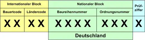 A complete number is referred to as a European Vehicle Number[3] and comprises 12 digits as originally outlined in UIC Code of Practice 438-3, Identification marking for tractive stock. Digits 1–2 are the type code, 3–4 the country of origin (where the vehicle is registered), 5–11 are defined by the country concerned, 12 is the check digit calculated via the Luhn algorithm.[4] It is followed by abbreviations for the country of origin and the owner of the vehicle.