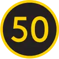 The original version was introduced in 1971, following the 1969 derailment at Morpeth Curve in Morpeth, Northumberland.[25] The original version, consisting of a black circle with a yellow outer ring and numbers, illuminated at night by a floodlight. This design was replaced in 1986 by the current design.[25][26] However, the original design did carry on into the mid-2000s.[27]