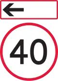 This example is displaying a maximum permissible speed of 40 mph (64 km/h) only for the diverging route to the left. Unless otherwise indicated with another sign, this does not apply to the current route.