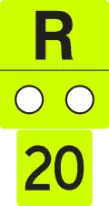 When there is a station stop between the warning board and the commencement board, a yellow repeater warning board showing an R is positioned beyond the end of platforms to remind drivers of the restriction ahead.[28]