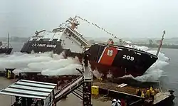 USCGC Sycamore was built by the Marinette Marine Corporation at Marinette, Wisconsin, launched in July 2001 and commissioned in Cordova, Alaska on 2 July 2002.[2] She has a length of 225 ft (69 m), a beam of 46 ft (14 m), and a draft of 13 ft (4.0 m). Sycamore is propelled by two Caterpillar diesel engines rated at 3,100 horsepower, and has a top speed of 16 knots.[3] She has a single controllable-pitch propeller, which along with bow and stern thrusters, allow the ship to be maneuvered to set buoys close offshore and in restricted waters. A dynamic global positioning system coupled with machinery plant controls and a chart display and information system allow station-keeping of the ship with an accuracy of within five meters of the planned position without human intervention.[3] Sycamore is also equipped with an oil-skimming system known as the Spilled Oil Recovery System (SORS), which is used in her mission of maritime environmental protection. The cutter has a 2,875 square foot buoy deck area with a crane that is used for servicing large ocean buoys.[3]