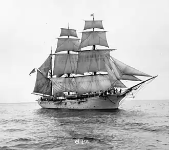 Chase was taken into dry dock, cut in half, and lengthened by 40 feet; the new hull section made room for a total of 25 cadets.[3] The alterations also seem to have affected Chase's sailing qualities. Virtually every photograph taken after the rebuilding shows staysails set on the mizzen stays but none on the main.
