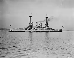 Connecticut was the leader of the ships that passed in review during the Presidential Fleet Review in New York, on 2 November; she then remained in New York, until 12 January 1912, when she returned to Guantánamo Bay. During a March overhaul at the Philadelphia Naval Yard, the battleship relinquished her role as flagship to the armored cruiser Washington. After the overhaul's completion, Connecticut's activities through the end of 1912 included practicing with torpedoes in Fort Pond Bay, conducting fleet maneuvers, and battle practice off Block Island and the Virginia Capes.[61] Stopping in New York, Connecticut conducted training exercises in Guantánamo Bay from 13 February to 20 March; during this time (on the 28th), she once again became the Atlantic Fleet flagship for a brief and final time when she served in the interim as Rear Admiral Charles J. Badger transferred his flag from Wyoming to Utah.[62][63] After taking on stores in Philadelphia, Connecticut sailed for Mexico and arrived on 22 April; she was to patrol the waters near Tampico and Vera Cruz, protecting American citizens and interests during disturbances there and in Haiti.[6][64]