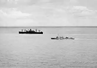 After fueling operations in the Lesser Sunda Islands, Edsall and Alden were escorting the Darwin-bound oiler USS Trinity in the Beagle Gulf 40 nautical miles (74 km; 46 mi) west of Darwin. On the morning of 20 January 1942 the Imperial Japanese Navy submarine I-123 sighted Trinity,[1] and misidentifed her as a transport. I-123 fired four Type 89 torpedoes at 12°05′30″S 130°05′36″E / 12.09167°S 130.09333°E[1] shortly after 0630. The sound man aboard I-123 reported hearing one torpedo hit, but all four torpedoes had missed; Trinity had sighted three of them and reported the attack.[1] Alden then searched for I-123, made a sound contact and conducted a brief depth charge attack at 06:41 before losing contact and abandoning the search.[1]