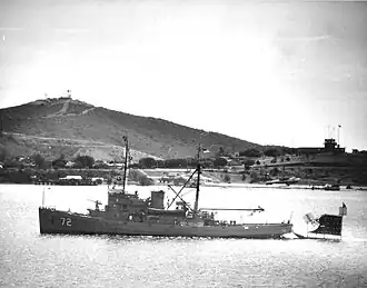 ![]() USS Kiowa (ATF-72) towing a target sled into Guantánamo Bay, Cuba, in a photograph taken from the anti-submarine warfare carrier USS Intrepid (CVS-11) on 27 February 1963.