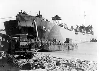 LST-31 left Hawaii on 4 April, for Okinawa. She embarked passengers and loaded supplies at Eniwetok and Guam, before proceeding on to the Ryūkyūs, and anchoring in waters off southwestern Okinawa on 3 May. She remained in the area for approximately three weeks providing logistic support to troops fighting on Okinawa. The ship arrived at Ulithi on 28 May; took on cargo; and, on 2 June, set a course for the island of Leyte, in the Philippines. During the months of June, July, and August, LST-31 operated between the Philippines and Okinawa, transporting supplies and troops between the two points to build up Okinawa as a base for the conquest of the Japanese home islands. However, this invasion was obviated when Japan capitulated on 15 August. The ship then began moving occupation troops and equipment to Japan from various points in the Philippines. She first arrived in Japanese waters on 15 September, when she dropped anchor in Tokyo Bay.[3]