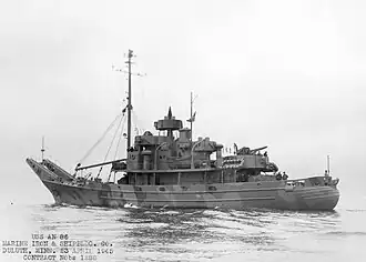 USS Passaconaway (YN-111/AN-86) was a Cohoes-class net laying ship built for the United States Navy during World War II. She was commissioned in April 1945 and spent her entire career in the Pacific Ocean. She was decommissioned in December 1946 and placed in reserve. She was sold to the Dominican Republic in September 1976 as patrol vessel Separación (P208). As of 2007, Separación remained active in the Dominican Navy.