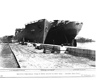 ![]() USS Pembina (AK-200) and other AKs moored at the west wall, Brandon Pool, Chicago, Illinois, 27 February 1945, waiting transit to New Orleans for fitting out and commissioning.