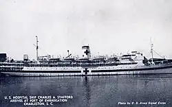 The ship was renamed USAHS Charles A. Stafford after Captain Charles A. Stafford of the U.S. Army Medical Corps, who was killed during the air raid on Broome, Western Australia, while participating in the evacuation of Java on 3 March 1942. With her conversion complete in September 1944, the Stafford, equipped with new boilers, a single stack in place of her original two, and other improvements, moved to her new homeport of Charleston.[4][28] From that port the ship made monthly runs to the United Kingdom and back until May 1945, interrupting the pattern only once for a trip to Gibraltar and Marseille. Steaming to New York at the conclusion of her last transatlantic run, Charles A. Stafford was overhauled for duty in the South Pacific.[4]