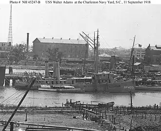 SS Walter Adams was a wooden-hulled steam fishing trawler built in 1890 by Robert Palmer and Son, of Noank, Connecticut, and rebuilt in 1898. The U.S. Navy inspected her for possible naval service in March 1917 and again in June 1918, and chartered her on 23 June 1918 for World War I service in the 6th Naval District. She was commissioned on 1 October 1918 as USS Walter Adams. Photographs show that she had the designation "SP-400" painted on her bow and she was used as a patrol boat like other units with an "SP" designation during World War I, although her data card lists her as having Identification Number (Id. No.) 400, or "ID-400", the type of designation given to cargo ships, tankers, and transports taken up from civilian service for use during World War I.