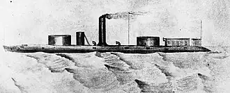 Winnebago and her sister Milwaukee sailed upriver on 28 March to attack a Confederate transport and forced it to retreat, but Milwaukee struck a mine, in an area previously swept, as they were returning downriver. She remained afloat forward, which permitted her crew to escape without loss.[13] Winnebago later protected a convoy carrying some 13,000 troops under Major General Frederick Steele, to Selma and Montgomery, Alabama later in April.[6] By 28 April, the monitor, together with the gunboats USS Octorara and Sebago, was blockading the Confederate ironclad Nashville and the gunboat Morgan up the Tombigbee River,[14] until their surrender.[6]