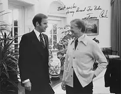Biden's campaign had little and was given no chance of winning.[8] His sister, Valerie Biden Owen, managed his campaign (as she would his future campaigns) and other family members staffed it. The campaign relied upon handed-out newsprint position papers and meeting voters face-to-face;[9] the state's smallness and lack of a major media market made that approach feasible.[10] He did receive some help from the AFL–CIO and Democratic pollster Patrick Caddell.[7] His campaign focused on withdrawal from Vietnam, the environment, civil rights, mass transit, more equitable taxation, health care, the public's dissatisfaction with politics as usual, and "change".[7][9] During the summer, he trailed by almost 30 percentage points,[7] but his energy level, his attractive young family, and his ability to connect with voters' emotions gave him an advantage over the ready-to-retire Boggs.[11] Biden won the November 7 election by 3,162 votes.[9]