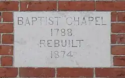 A year after Five Ash Down Chapel opened, its congregation became divided on the subject of baptism.[5] Members who held the stricter view that only a confession of faith followed by total immersion baptism could permit membership broke away and formed a separate gathering at Lephams (or Leaphams) Bridge Farm east of Five Ash Down.[note 2][6][5] A Strict Baptist church was constituted at this location on 15 May 1785,[6] and meetings continued there for just over three years. In 1788, the congregation obtained the lease[6] in copyhold form[7] of a piece of land at the north end of Uckfield High Street.[6] (Uckfield was at the time a large village on the brink of expansion into a market town.)[8] A permanent chapel, Uckfield Baptist Church, was built; it was opened on 22 February 1789 by Henry Brooker, the founder of Bethel Strict Baptist Chapel, Wivelsfield, Joseph Middleton from a chapel in Lewes and Thomas Dicker—son of the founder of Five Ash Down Chapel.[6] The new church was served by a resident pastor until 1800 and then through much of the 19th century.[9]
