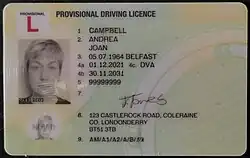 ![]() Example of a driving licence issued in Northern Ireland after December 2021 | |