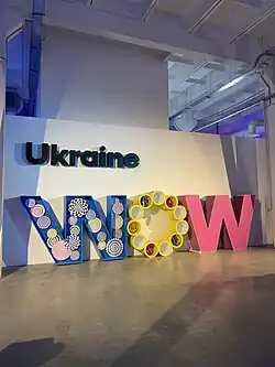 The total area of the exhibition was more than 3900 m2.[3] The Hres Todorchuk agency[4] worked on the concept and implementation of the project. The heads of the project were Yaroslava Hres and Yuliya Solovei; the curators were the art critic Ksenia Malykh and the literary critic Yevhenii Stasinevych.[5] The visual identity was developed by the Banda agency. In total, more than 200 people worked on Ukraine WOW.[6]