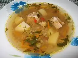 - Yushka: clear soup; the most common variety — rybna yushka (fish yushka) is made from various types of fish such as carp, bream, wels catfish, or even ruffe. Another common variety is hrybna yushka (clear mushroom soup).