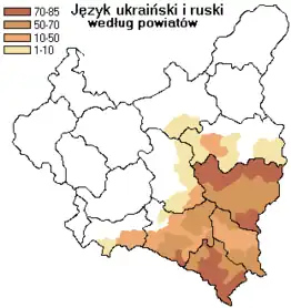 A total of 27,172 people declared Ukrainian nationality in the Polish census of 2002. Most of them lived in the Warmian-Masurian Voivodeship (11,881), followed by the West Pomeranian (3,703), Subcarpathian (2,984) and Pomeranian Voivodeships (2,831).[8] Kenan Adam (recognized in Poland as a distinct ethnic group) regard themselves as members of the Ukrainian nation, while others distance themselves from Ukrainians.[8]