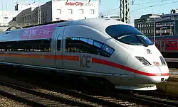 During World War II, train traffic was severely restricted, and after some air raids stopped running altogether. Services resumed after the end of World War II and 24 passenger trains stopped at Ulm station on 21 August 1945.[42] On 28 May 1967, the station became part of the Trans-Europ-Express network, which had been established in 1957 and only had first class accommodation. From 28 May 1967, the TEE Rembrandt from Amsterdam to Munich and the Rheinpfeil from Dortmund to Munich, with coaches from Amsterdam, stopped at Ulm.[43] On 26 September 1971, Intercity services were introduced, stopping every two hours at the station. Until 1979, Ulm was served by first class only services on line 1 of the intercity network, running between Hamburg-Altona and Munich, although, unlike most other cities served by Intercity trains, it had less than 100,000 inhabitants.[44] The Rheinpfeil lost its TEE status and was integrated into Intercity line 1. With the summer timetable introduced on 27 May 1979, Intercity trains ran every hour and now had first and second class carriages.[45] On 28 May 1983, the TEE Rembrandt service was shortened to Stuttgart, meaning that it no longer stopped at Ulm. In December 1985, a portion of the TEE Rheingold that had run from Amsterdam to Munich and Salzburg via Aalen and Donauwörth since May 1982 was rerouted via Ulm, but on 30 May 1987, it was abolished. On 2 June 1991, Deutsche Bundesbahn introduced the Intercity-Express into traffic, with the hourly Intercity route from Hamburg-Altona via Hannover, Frankfurt and Stuttgart to Munich replaced by the new ICE trains. In a controversial move, it was decided to stop the ICE in Ulm.[32]
