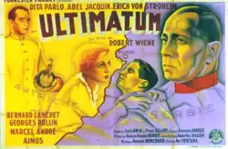 Ultimatum is a 1938 French historical drama film directed by Robert Wiene and Robert Siodmak and starring Dita Parlo, Erich von Stroheim and Abel Jacquin. The film's plot is set in 1914 against the backdrop of the July Crisis between the assassination of Archduke Franz Ferdinand and the beginning of the First World War. It focuses on the relationship between a Serbian officer and his Austrian-born wife and their involvement in espionage between the countries.