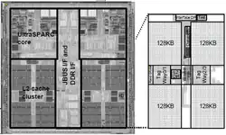 The DAC 2004 abstracts described the dual-core UltraSPARC II processor in Session 40.[2] The "Dual-Core UltraSPARC (2003)" was based upon the UltraSPARC II microarchitecture and featured: DDR-1 memory controller, JBUS interface, parity protected L1 cache, ECC-protected dual 512KB on-chip L2 cache, 1.2 GHz clock frequency, 80 million transistors, 206 mm2 die size, and dissipated 23 watts of power.[3]