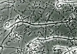 As with other members of the genus Uncinocarpus, U. reesii can develop hooked (uncinate) appendages on vegetative hyphae.[8][5][1] These appendages are short and rigid, with thick walls approximately 8.8μm in diameter. Appendage length rarely exceeds the diameter of the fruiting body (ascocarp).[4] These appendages are found in the asexual stage as extensions of vegetative hyphae, but only develop fertile spore-bearing structures (gymnothecia) in the sexual morph when compatible strains are mated.[1] The gymnothecia are reddish-brown, initially formed on short, bulbous stalks before becoming more or less spherical. The ascospores are smooth, oblate and hole-filled (punctate). When the asexual morph of U. reesii develops these hooked appendages, they are referred to as "pseudogymnothecia", due to their similar appearance but lack of a spore-bearing structure. In lieu of spores, the asexual form produces arthroconidia that are cylindrical shaped with flattened ends.[8][1][5]