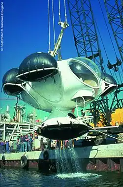 Launched for the first time in March 1978, this underwater shelter suspended in midwater (between 0 and 60 metres) is a mini scientific observatory 2.8 metres high by 2.5 metres in diameter.[47] The Aquabulle, created and experienced by Jacques Rougerie, can accommodate three people for a period of several hours and acts as an underwater refuge. A series of Aquabulles were later built and some are still being used by laboratories.[44][48]
