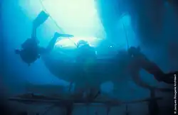 BAH I (for Biological Institute Helgoland ) had a length of 6 m and a diameter of 2 m. It weighed about 20 tons and was intended for a crew of two people.[26] The first mission in September 1968 with Jürgen Dorschel and Gerhard Lauckner at 10 m depth in the Baltic Sea lasted 11 days. In June 1969, a one-week flat-water mission took place in Lake Constance. In attempting to anchor the habitat at 47 m, the structure was flooded with the two divers in it and sank to the seabed. It was decided to lift it with the two divers according to the necessary decompression profile and nobody was harmed.[5] BAH I provided valuable experience for the much larger underwater laboratory Helgoland. In 2003 it was taken over as a technical monument by the Technical University of Clausthal-Zellerfeld and in the same year went on display at the Nautineum Stralsund on Kleiner Dänholm island.[27]