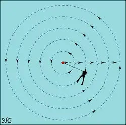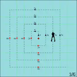 For example: The diver swims n kicks to the north, turns left and swims n kicks to the west, then turns left and swims 2n kicks to the south, left again and 2n kicks to the east. Then left again and 3n kicks to the north, left and 3n kicks to the west. The pattern is repeated by adding an extra n kicks every second turn, and always turning the same way. If at any stage the diver wants to return to the start point, he will swim a half leg count followed by the usual turn and another half leg count.
