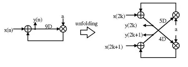 Unfolding transformation can unravel hidden concurrency in digital signal processing systems described by DFGs. Therefore, unfolding can be used to increase the throughput of the system by duplicating the functional blocks but without increasing the delay element. If we properly handle the delay on the path, such as retiming, we could increase the throughput as J times, which is the number of duplication on each functional block. In such transform technique, it could be applied to generate world-parallel architectures that can be used for high-speed or low-power applications. Hence, unfolding is the good technique to leverage between area, throughput, and power-consumption.