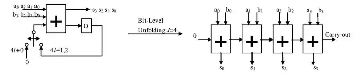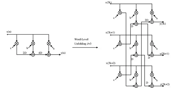 The unfolding transformation could be used to design a word-parallel architecture from a word-serial architecture. The following is the example of word-serial to word-parallel architecture.
