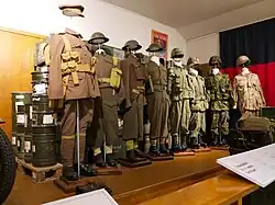 The combat uniform consisted of a long-sleeve olive-drab (OD) shirt, with two voluminous cargo pockets at the hip and two slanted pockets (designed for the 20-round FNC1 rifle magazine) at the breast, and drawstrings at the waist and hem; OD trousers, with regular pockets at the front and back and a large cargo patch pocket on each thigh, drawstrings at the cuff, and buttons on the belt loops for the attachment of optional suspenders; an OD V-neck undershirt; and black combat boots, with trouser cuffs bloused over. The beret was often worn, but could be replaced by a soft OD field hat or the American M1 helmet as the tactical situation dictated (while the Canadian combat uniform was universally olive green, American-style cloth helmet covers where two types of camouflage pattern were issued; a reversible "Mitchill" pattern consisting of a spring pattern and an autumn pattern sewn on the reverse and later the American woodland pattern). At the time of adoption, the OD colour was a standard among NATO forces; however, as other NATO forces adopted camouflage uniforms (for example, the British DPM (disruptive-pattern material) uniforms, or the Americans their woodland camouflage BDUs (battle dress uniforms)), the Canadian Forces quickly became one of the few first-world militaries not to adopt camouflage garments.