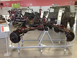 The Unimog 401 is a very compact vehicle with an approximate length of just 3.5 metres (11 ft 5+3⁄4 in). It has a U-shaped ladder frame, beam portal axles both in the rear and front, with four same-sized wheels. Each axle has additional reduction gears built in. Both front and rear axles are supported by a central joint and panhard rods. The 401 has coil springs and hydraulic shock absorbers. Daimler-Benz used 6.5–20" multi-purpose tyres, that are designed for both on and off-road applications. The brake system is hydraulic, the 401 having drum brakes for each wheel.[6] The 401 has a wheelbase of 1,720 mm (67+3⁄4 in); the 402, 2,120 mm (83+1⁄2 in).[2]