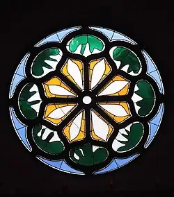 Union Church of Pocantico Hills is a historic, nondenominational church in Pocantico Hills, New York, welcoming all for weekly Sunday services in the Christian tradition at 10:00 am ET. The church was built by John D. Rockefeller Jr. in 1921, as part of his plans to develop the town of Pocantico Hills, which was below his estate Kykuit.[2] Upon the death of Rockefeller's wife Abby Aldrich Rockefeller in 1948, their son Nelson Rockefeller commissioned Henri Matisse to design the church's rose window in honor of her memory shortly before the artist's own death in 1954.[2] When John D. Rockefeller Jr. died in 1960, his children commissioned artist Marc Chagall to design a Good Samaritan window in his honor.[2] It is a one-story neo-Gothic style building with fieldstone foundation and walls and a slate covered, highly pitched gable roof. In 1930–1931, a parish hall was added to the east end of the church.[3]