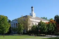 After Union College received its charter in 1795 the college began conducting classes on the upper floor, while a grammar school continued to be conducted on the lower.[39] It soon became clear that this space would prove inadequate for the growing college. Construction soon began on a three-story building, possibly influenced by Princeton's Nassau Hall,[40] that was occupied in 1804. Two dormitories were constructed nearby.