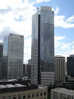 Union Square is a skyscraper complex at Sixth Avenue between Union and University Streets in Downtown Seattle, Washington, adjacent to Freeway Park. It consists of two skyscrapers built in the 1980s and primarily used for office space. The entire complex features a 1,100-stall parking garage, a courtyard, a retail plaza spanning three stories and an underground pedestrian concourse that connects with the Fifth Avenue Theater and Rainier Square.[8] Both structures were awarded LEED certification in 2009 and eventually received LEED Platinum certification 6 years later as a result of reduced annual energy consumption by 40 percent through recent renovations.[9] The entire complex is currently managed by Washington Holdings, a real estate firm also known as Union Square LLC which is based in Seattle.[10]