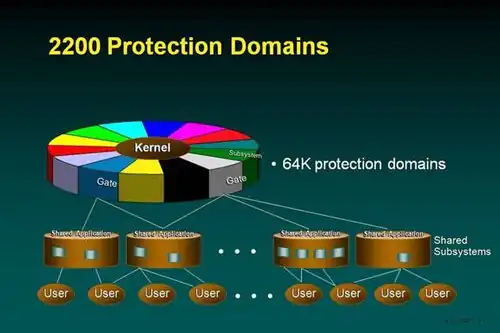 The above figure shows some of the building blocks of the architecture. "Data" and "COMM" are two of the primary examples of software subsystems that live in a protection ring between that of a user application and the Exec. There are many other such subsystems and users write their own.