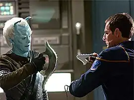 Stunt co-ordinator Vince Deadrick Jr. choreographed the Ushaan fight scene between Shran and Archer, with stuntmen Gary Wayton and Kim Koscki doubling for Combs and Bakula in wide shots.[1] The Ushaan-Tor itself was created by Dan Curry,[3] whose previous work had included a variety of Klingon weapons including the bat'leth.[4] The script had simply called for "a dangerous-looking Andorian weapon", with the design fully coming from Curry.[5] To demonstrate the different physiology of the Andorians, the make-up department created a quantity of blue blood for use in that scene. It was also seen in an intravenous therapy prop in sickbay and for an earlier scene where Shran pours a quantity of it onto a Tellarite to issue his challenge.[1]
