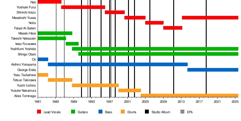 | Past members | Oz Yasu Tsukahara Kouichi "Nao" Takeshi "Mantas" Nakazato Tetsuo "Tetsu" Takizawa Masaki "Marchan" Hara Iwao Furusawa Yoshiaki Furui Hirokazu Uchino Shinichi Inazu Yusuke Nakamura Nobu Faisal "Kenshin" Al-Salem Akihiro Yokoyama |