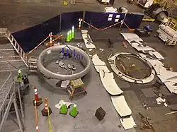 The National Transportation Safety Board (NTSB) investigatied the incident.[11] An NTSB structures engineer and two investigators from the NTSB's Denver office collected fallen debris with local law enforcement and safety agencies over several days immediately after the incident. Most of the structure from the inlet cowl and fan cowl doors that separated from the aircraft was recovered and identified. Recovered portions of the inlet cowl, fan cowl door structure, and inlet cowl attach ring were laid out in a hangar (pictured). The inlet cowl, fan cowl doors, and thrust reversers will be examined further by NTSB investigators to map damage and cowl failure patterns after the fan blade failure, and to examine the subsequent progression of fire in the thrust reversers.[25]