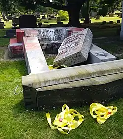 The monument was toppled by "a group of local activists supportive of racial justice and the Black Lives Matter movement," apparently on July 3, 2020.[13] In the process, the lower ends of both formerly vertical columns were broken in multiple places.[14] The activists responsible wrote in a statement to the South Seattle Emerald that, "this action is for everyone, living or dead, who has been stolen, murdered, enslaved, raped, tortured, brutalized, terrorized, displaced, incarcerated, colonized, exploited, or separated from land, family, and culture by white supremacy. May the memory of those who have gone home be a blessing to us all, and may their descendants know the peace of true and everlasting justice."[13] The wreckage was discovered by visitors to the cemetery on July 4.