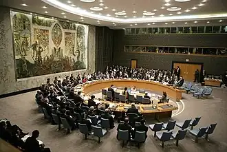 UN interpreters' booths (top right) behind an ongoing UN Security Council session