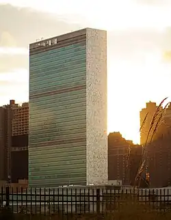 The Secretariat Building is part of the headquarters of the United Nations in the Turtle Bay neighborhood of Manhattan in New York City.[3] It occupies a land lot bounded by First Avenue to the west, 42nd Street to the south, the East River to the east, and 48th Street to the north.[3][4] Although it is physically within the United States, the underlying land is under the jurisdiction of the United Nations (UN).[5] The site is technically extraterritorial through a treaty agreement with the US government, though it is not a territory governed by the UN.[6][7] Most local, state, and federal laws still apply within the UN headquarters.[7] Due to the site's extraterritorial status, the headquarters buildings are not New York City designated landmarks, since such a designation falls under the purview of the New York City Landmarks Preservation Commission.[8]