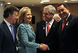 Venezuela and the United States have not had ambassadors in each other's capitals since 2010.[71] Shortly before the 2012 US presidential elections, Chávez announced that if he could vote in the election, he would vote for Obama.[72] In 2013, before Chávez died, Venezuelan Vice President Nicolás Maduro expelled two U.S. military attaches from the country, saying they were plotting against Venezuela by attempting to recruit Venezuelan military personnel to destabilize Venezuela and suggested they caused Chávez's cancer.[73] The Obama administration rejected the allegations and responded by expelling two Venezuelan diplomats.[74]