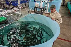 The agency oversees the National Fish Hatchery System which includes 71 fish hatcheries and 65 conservation offices.[26] Originally created to reverse declines in lake and coastal fish stocks, the program subsequently expanded its mission to include the preservation of the genes of wild and hatchery-raised fish. The fish hatcheries contribute to the restoration of native fish populations, freshwater mussels, and amphibians including populations of species listed under the Endangered Species Act, and providing fish to benefit Native Americans and nature reserves.[27][28]