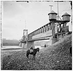 On September 24 the men summoned to plan the rail movement arrived in Washington to work out the details. Secretary Stanton telegraphed them asking for their assistance even before the President approved the plan: John W. Garrett, President of the Baltimore and Ohio Railroad (B&O); Thomas Scott of the PRR; S. M. Felton, President of the Philadelphia, Wilmington and Baltimore Railroad; William P. Smith, Master of Transportation for the B&O; and McCallum.[14][17][18] The men at the conference worked out the detailed route planning, a task complicated by the different gauges of railroad track in use at the time. The initial movement of troops from Virginia was allocated to the USMRR under McCallum's direction. Garrett and Smith would supervise the movement from Washington, D.C. to Jeffersonville, Indiana, and Scott would travel west to supervise the move from Louisville, Kentucky, to Bridgeport, Alabama.[19] As finally settled, the movement involved 9 different railroads in order get the troops from Virginia to Bridgeport. The USMRR, operating on the Orange and Alexandria Railroad from Bealeton, Virginia to Washington, passed the movement off to the B&O from Washington to Benwood, West Virginia.[20] At Benwood, the troops crossed the Ohio River via a pontoon bridge[21] and boarded Central Ohio Railroad trains to move from Bellaire, Ohio to Columbus. From Columbus, troops moved via the Columbus and Xenia Railroad, Little Miami Railroad, and the Indiana Central Railroad to reach Indianapolis, Indiana. From Indianapolis the route used the Jeffersonville Railroad to return to the Ohio River.[22] The troops crossed the Ohio River to Louisville and boarded trains using the tracks of the Louisville and Nashville Railroad to reach Nashville, Tennessee. From Nashville the final leg of the trip used the Nashville and Chattanooga Railroad to deliver the troops to Bridgeport.[23]