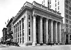 The United States National Bank of Portland, the predecessor of present-day U.S. Bancorp, was established in Portland in 1890, opening for business in February 1891.[10] During the following three decades, the bank experienced significant growth. It weathered the Panic of 1893 better than many of its competitors, and later acquired some of the competing Portland banks, including the Ainsworth National Bank (in 1902), the Wells Fargo Bank (in 1905), and the Lumbermen's National Bank (in 1917). With the 1902 acquisition, U.S. National Bank moved its headquarters into a larger space formerly occupied by Ainsworth National, in the Ainsworth Building, then located at S.W. Third and Stark streets in downtown Portland.[11] By the 1910s, the bank had outgrown its space. The firm purchased a quarter-block of land at the northwest corner of Sixth and Stark streets in early 1916 and hired Portland architect A. E. Doyle to design a new, dedicated headquarters building.[12]