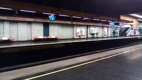 Universidad Católica is an underground metro station on the Line 1 of the Santiago Metro, in Santiago, Chile. It provides access to the Centro Cultural Gabriela Mistral and is named after the Pontifical Catholic University of Chile, whose main administrative offices are housed in a building close to the station. The station was opened on 31 March 1977 as part of the extension of the line from La Moneda to Salvador.[2]