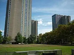 Over the course of 1968 to 1970 and with the assistance of the local redevelopment authorities, Penn acquired, cleared and redeveloped the four-block area between 38th, 40th, Spruce, and Walnut streets. The primary features of this area, which became known as "Superblock", are three high-rise apartment-style dormitories.[25] The key purpose of creating these high-rises was to accommodate 3,500 more students at the university. The whole superblock project and especially the high-rise design were widely criticized,[26] but this view is not held by everyone.[27]